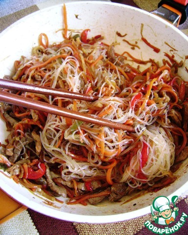 Посыпать пряностями, чуть посолить и посыпать сахарной пудрой. Снять с огня и добавить фунчозу. Перемешать и дать настояться минут 10.