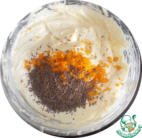 (В изначальном рецепте цедры не было, но она, на мой вкус, очень хорошо оттеняет тмин. Если хотите не оттенок, а выраженный апельсиновый вкус, берите цедру с двух апельсинов.) -