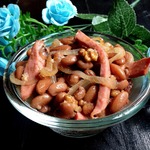 Все подготовленные ингредиенты соединить с отварной фасолью, приправить солью, хмели-сунели, свежемолотым перцем и виноградным уксусом.