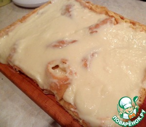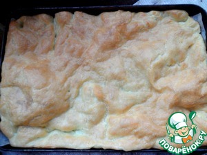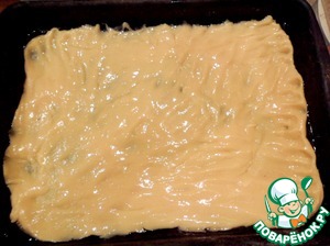 Тесто выложить тонким слоем в смазанный маслом противень, размером 30x40 см.