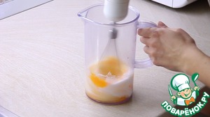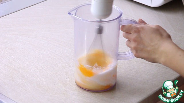 • 3 яйца взбить со 150 г сахара. Взбивать нужно 5-7 минут до получения густой, пышной пены.