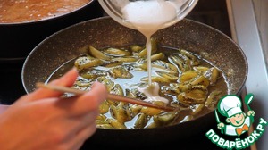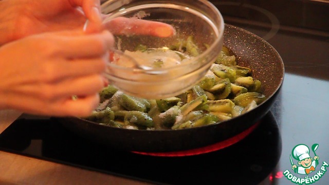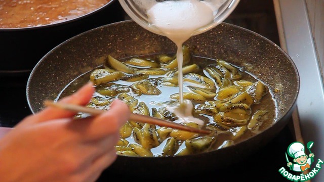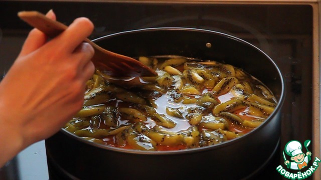 • 500 г киви режем на кусочки, выкладываем в сковороду, засыпаем 150 г сахара и доводим до кипения. Кипятим на медленном огне 5 минут. Через 5 минут отставляем киви, чтобы оно остыло.