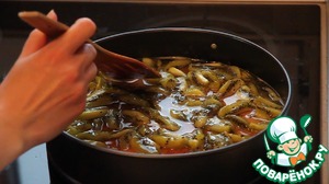 • Вливаем желатин в киви, перемешиваем и даем остыть до 30°С.