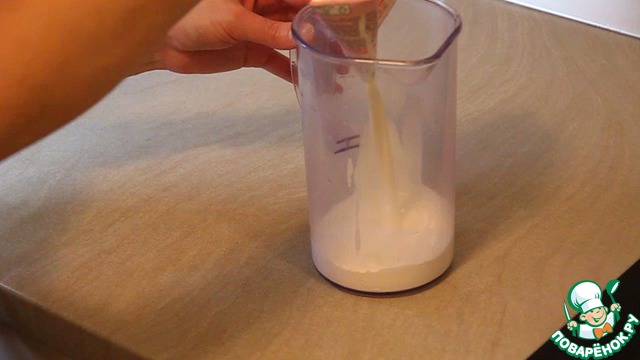 • Когда вы добьетесь густой устойчивой консистенции можете добавлять 200 г свежей сметаны двадцати процентов. Взбивайте всё вместе еще пару минут.