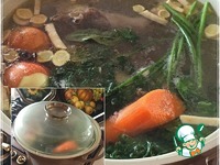 И все, что для бульона было нужно, т. е. было заготовлено, в кастрюлю отправили. И как только взбулькнуло, сразу огонь на минимум, крышкой прикрыли и, пусть себе томится бульон… часа два – не меньше. |