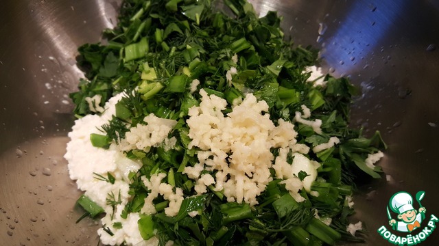 Займёмся второй начинкой. Нарезать зелень, солёные огурцы, выдавить чеснок чеснокодавкой. Смешать рикотту, сметану, зелень, чеснок, огурцы, добавить лимонный сок и главное - не съесть!!! Попробуйте на соль. Мне хватило солёности огурцов.