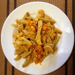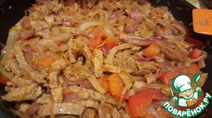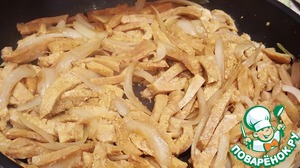 • Растапливаем на сковороде масло и обжариваем репчатый лук. Добавляем нарезанное соломкой мясо. Обжариваем.