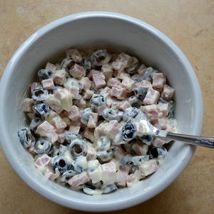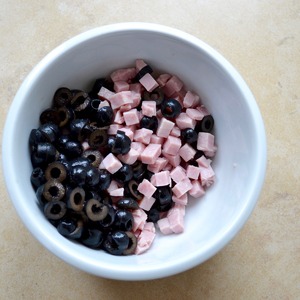 Вареную ветчину нарезать небольшими кубиками. Сложить в миску. Оливки также нарезать и добавить к ветчине.