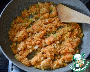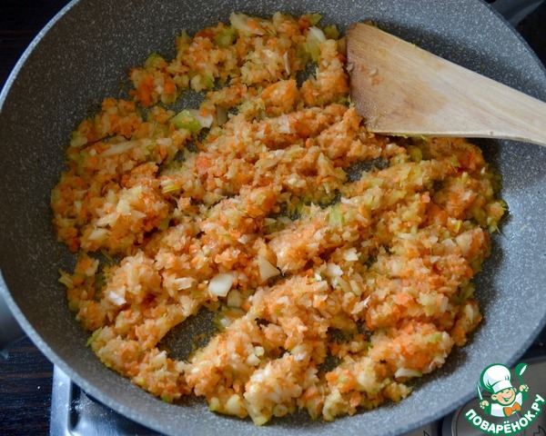 Тем временем, овощи очистить и мелко нарезать (можно это сделать с помощью блендера для достижения однородности нарезки овощей. Количество овощей можете регулировать также на свой вкус. Я беру 2 небольшие морковки и 2 луковицы...) Петрушку измельчить. В сковороде с тяжелым дном разогреть 2 ст. л. оливкового масла. Положить обжариваться овощи. -