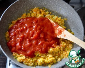 Добавить к овощам предварительно размятые томаты в собственном соку. Посолить и поперчить по вкусу.