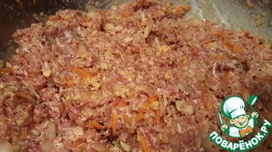 Мелко нарезать лук и натереть на тёрке морковь, добавить в фарш. Выдавить через чеснокодавку чеснок, добавить сахар и коричневые зёрна горчицы.