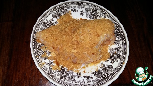 Сырое куриное яйцо перемешиваем вилкой, слегка подсаливаем и приправляем хмели-сунели. Купаем грудки в яйце и обваливаем в панировочных сухарях.