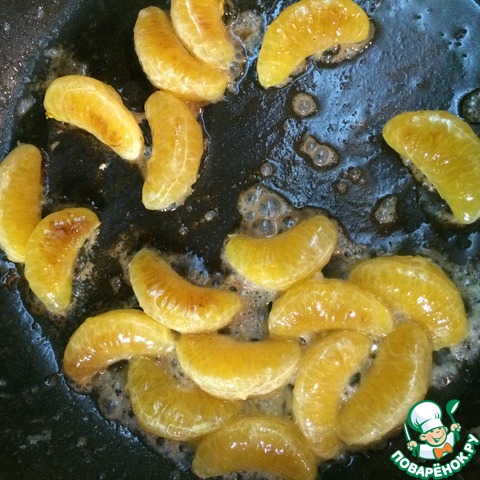 Все продукты должны быть комнатной температуры! Сухофрукты за несколько часов промыть, обсушить, нарезать и замочить в алкоголе. Мандарины очистить, подсушить и карамелизовать (две ст. л. Сахара и 20гр сливочного масла положить на сковороду и не мешая на среднем огне довести до состояния карамели, выложить дольки мандарина и обжарить до красивого карамельного оттенка.)