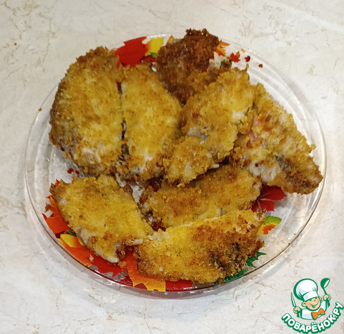 Разогреваем сковороду. Наливаем немного оливкового масла для жарки. Обваливаем рыбку в панировочных сухарях.