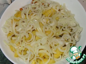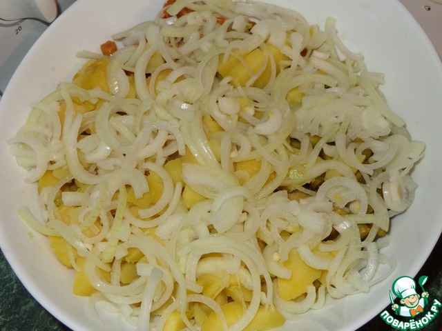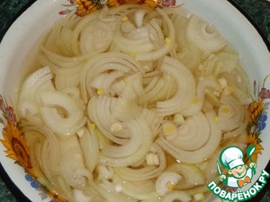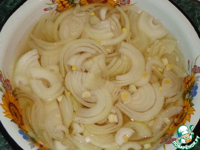 Пока варится картофель маринуем лук. В стакане воды (холодная кипяченая или бутилированная) растворить соль и сахар, добавить уксус. Лук нарезать полукольцами и оставить мариноваться.