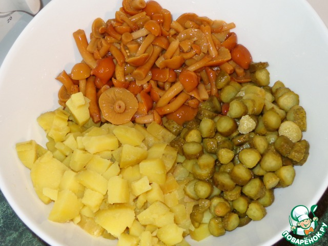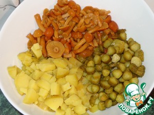 Далее картофель и огурцы нарезаем кубиками, У меня были огурцы очень мелкие (пикуль), я нарезала их кружочками. В рецепте был указан вес огурцов магазинных в баночке. С грибов сливаем жидкость и добавляем в салат (я использовала опята маринованные), можно любые другие маринованные грибы.