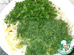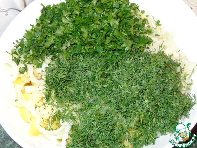 Укроп и петрушку мелко нарезать и отправить в салат.