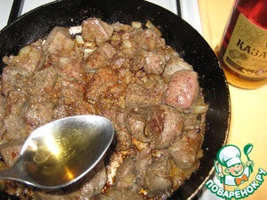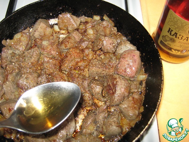 Посолить, добавить специи, выключить огонь, влить коньяк для аромата и вкуса, перемешать, печень очень "дружит" с ним))
