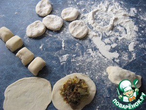 И как обычно - раскатать кусочек теста в жгут, нарезать на кусочки, раскатать лепешки, начинить, слепить вареники.