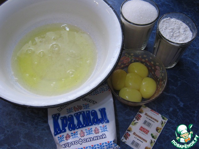 Подготовить продукты. Неполный стакан муки и столовую ложку с горкой крахмала соединить и просеять. Отделить белки от желтков.