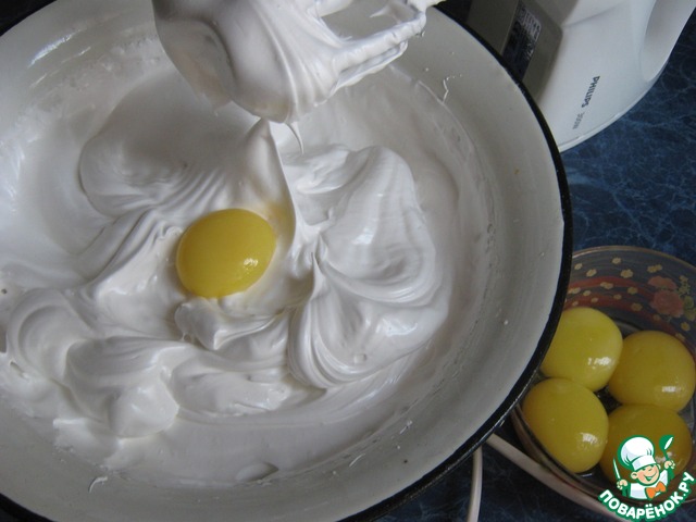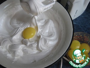 По одному ввести желтки, не прекращая взбивания.