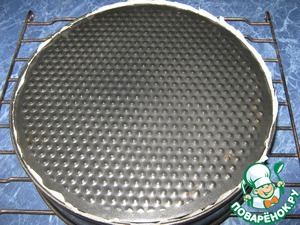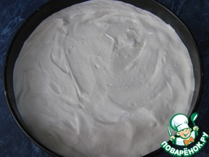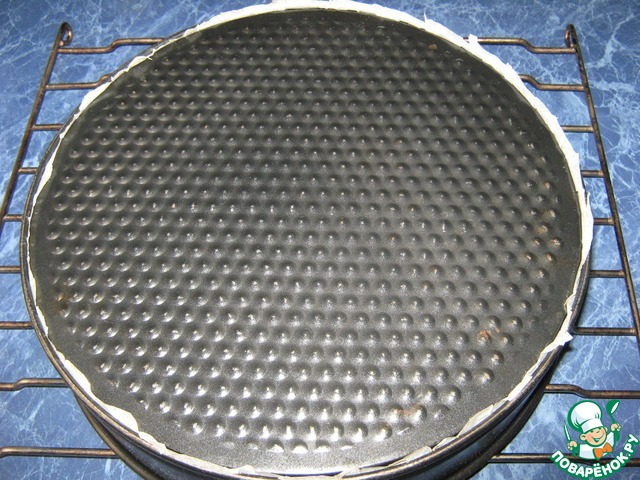 Разъемную форму я застелила пергаментом и вылила тесто. Печь бисквит 25-30 минут при 180 градусах.