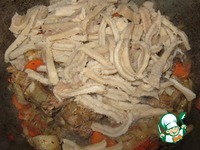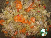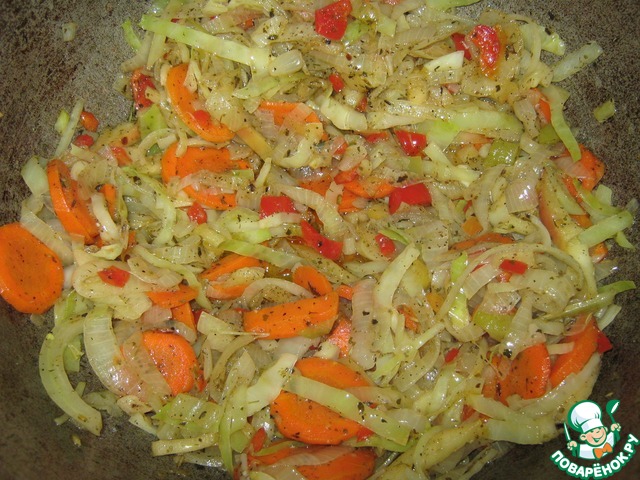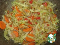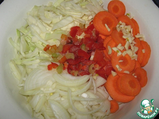 Нашинковать капусту, нарезать морковь кружочками, лук полукольцами, чеснок мелким кубиком, перец болгарский небольшими брусочками (у меня замороженный) |