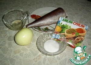 1. Очищенную от плавников рыбу снаружи и внутри посолить, поперчить, обмазать приправой.