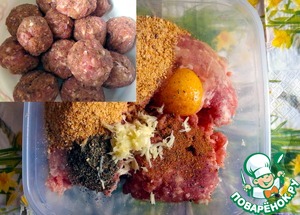 Смешиваем фарш, яйцо, сухари, половину измельчённого чеснока, соль, перец и базилик. Лепим наши тефтельки.
