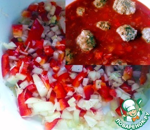 Добавляем томаты, томатное пюре, воду и тефтели. Накрываем и тушим 5 минут.