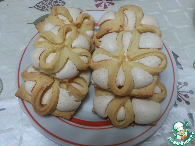 На середину квадрата выложить по 1ст. л. начинки, с углов поднять тесто к середине, защипнуть. Выложить на бумагу для выпечки. Выпекать при температуре 180 градусов около 15 минут. Печенье остудить и подать к столу.