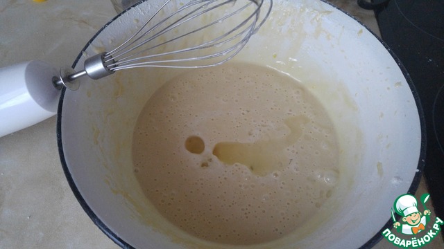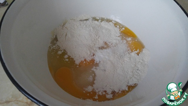 Соединяем яйца, муку, сахар и соду, взбиваем минуты 4.