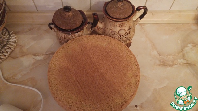 Выпекать при 180 градусов 30 минут, выключить духовку и дать постоять минут 15 при открытой дверце. Дать отдохнуть коржу и разрезать на две части.