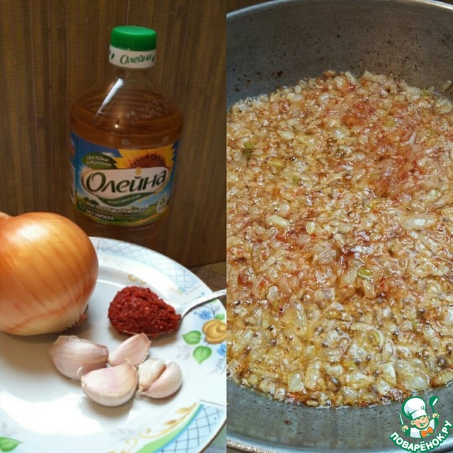 Пока овощи готовятся, приготовьте зажарку. Мелконарезанный лук довести до золотистого цвета на растительном масле "Олейна". Добавить пропущенный через пресс чеснок и аджику. Прогреть зажарку, помешивая, около 2 минут.