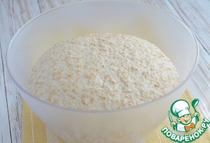 Сначала нужно сделать опару: смешать 200 г муки (из общего количества) с дрожжами, сахаром и водой.