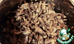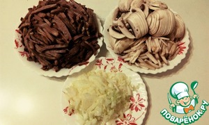 Отварной язык и шампиньоны нарезать соломкой. Лук кубиком.
