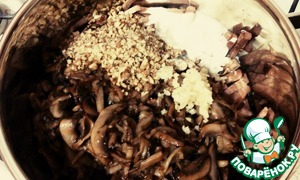 В кастрюлю с толстым дном сложить : язык, грибы, орехи, чеснок продавленный через пресс, сметану. Можно немного добавить воды, если сметана сильно густая. Все перемешать и на медленный огонь тушиться, часто помешивая.
