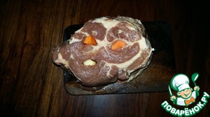 При помощи длинного тонкого ножа делаем в мясе надрезы, смазываем разрезы внутри аджикой и заполняем подсоленными кусочками моркови и чеснока.