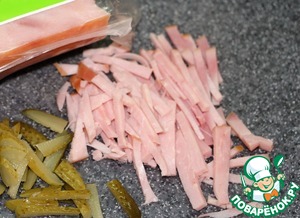 Для начинки нарезать соломкой маринованный огурец и ветчину