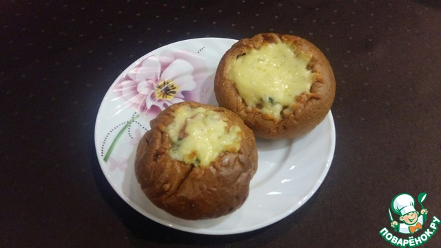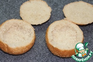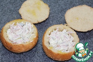 У булочек срезать верхушки, вынуть мякиш, сбрызнуть булочки изнутри растительным маслом.