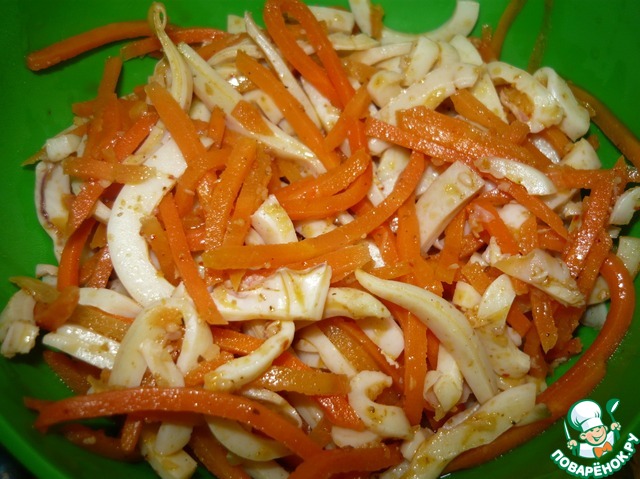 Морковь натереть на терке для корейской моркови или нарезать соломкой, залить кипятком и оставить на 5 минут, слить воду. Лук избавить от маринада, смешать с кальмарами и морковью, украсить зеленью.