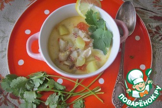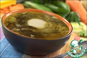 Открыть банку консервированной морской капусты и банку сайры, добавить их содержимое в суп. Посолить, приправить лавровым листом. За 5 минут до готовности разболтать в миске одно яйцо со столовой ложкой сметаны, аккуратно влить смесь в кастрюлю, размешивая вилкой.