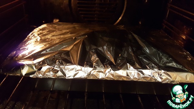 Потом уменьшаем температуру в духовке до 180*, накрываем мясо фольгой и печём еще около часа до готовности. Можно открыть фольгу через час и ещё чуток подержать рулет в духовке.