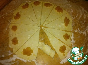 Добавляем свое любимое повидло или джем и катаем рогалики. Края можно защипнуть, чтобы начинка не вытекала. Я использовала домашний яблочный джем. Кто любит послаще, то можно каждый рогалик обвалять в сахаре.