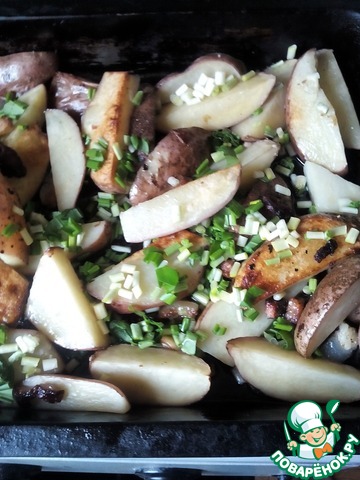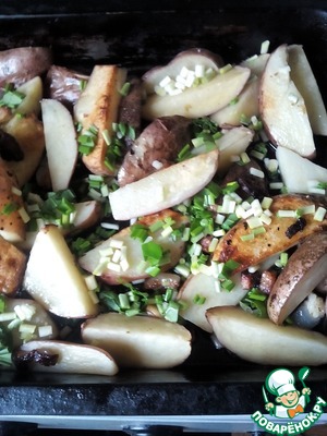 Перемешиваем нашу картошку деревянной лопаткой, посыпаем мелконарезанной черемшой и снова отправляем в духовку на 5-10 минут. -