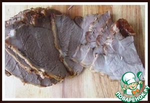 Разворачиваем мясо и тонко нарезаем