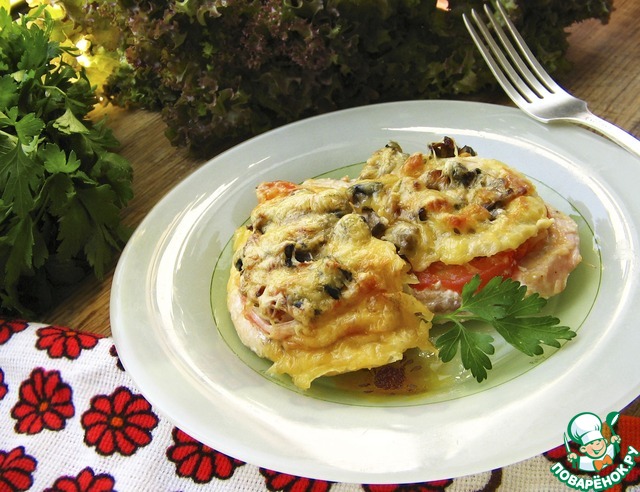 Предлагаю вам вкусное, красивое и сытное горячее блюдо из куриной грудки. Готовить его просто, нехлопотно, а выглядит оно нарядно, удобно распределять порциями.