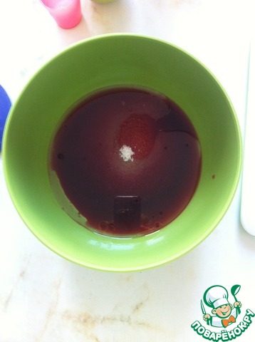 В миску налить сок ( у меня вишневый), добавить сахар и растительное масло, хорошо перемешать.