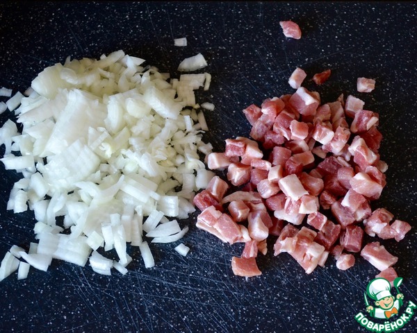 Итак, нарезать некрупно грудинку (или ветчину) и измельчить лук. -