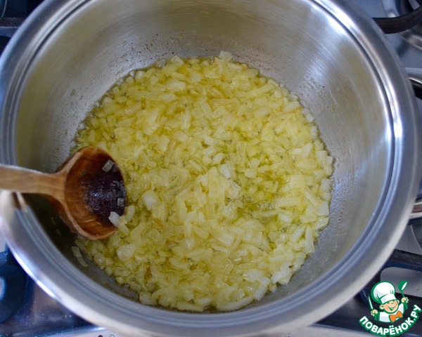 В широкой кастрюле растопить сливочное масло и потушить в нём лук.